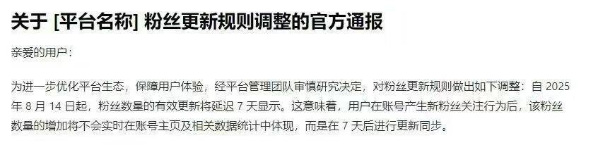 重要通知!抖音有效粉改规则。有效粉更新时间需要7天!作者: 野马 / 2025年8月14日 抖音官方自2025年8月14日起进行粉丝更新规则调整,调整后有效粉将延迟7天显示,并非原先的48小时了,请注意